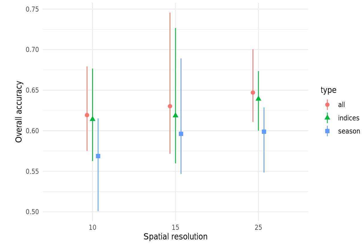 We learned that a medium resolutions seems beneficial and that seasonal parameters are able to increase the classification accuracy at about 1-2 %. There were also indications, that object-based classification has the potential to significantly increase the overall accuracy.